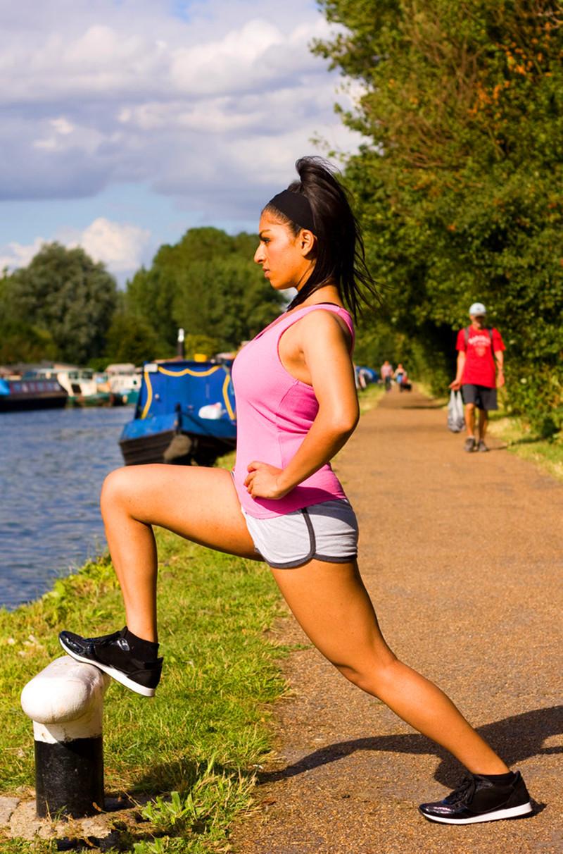 训练者保持弓箭步,后腿单腿跪地大腿垂直地面,前腿的大腿和小腿成90度,支撑身体,运动时身体俯身然后让臀部向后坐,感受前支撑腿小腿有强烈的拉伸感。