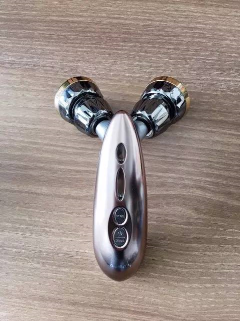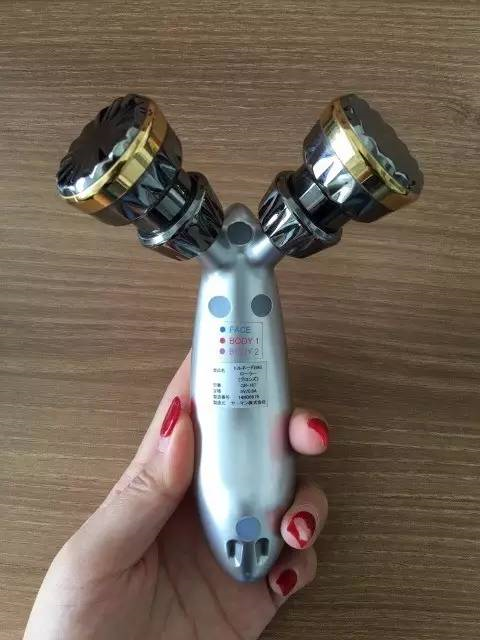 这款是通过两个铂金轮之间的角度挤压推滚按摩,全身淋巴排毒和面部肌肉都可以使用,有三种不同的电流:有适合脸部的微电流,也有适合胳膊和腿部的电流,还有一个适合腹肌和腰部的大电流。