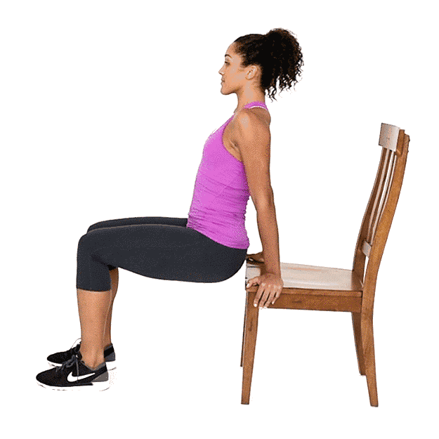 做这个动作时,我们需要一个椅子作为辅助工具,双手反向支撑在椅子上,大腿和小腿成直角蹲坐,要保持臀部离开椅子面,依靠手部的力量,向上向下做屈伸动作。