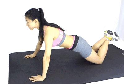 首先我们要先像做俯卧撑一样,支撑在地面上,不同之处在于膝盖着地,两脚交叉抬起离开地面。然后利用手臂的力量,做半身俯卧撑动作。过程中要加紧臀部和腹部的肌肉,上身和大腿呈一条直线。