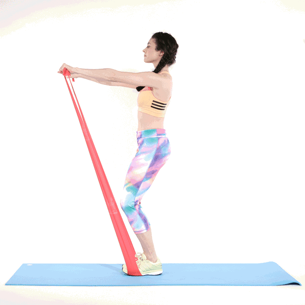 做这个动作时,我们需要一条弹力带做辅助工具。首先,水平站立在地面上将弹力带的中部踩在脚底下,双手握住弹力带的两端,膝盖呈一定的角度,略微弯曲。双手抓住弹力带向上提起的同时,做前后拉伸动作,提升过程中,可轻微前后移动,但一定要保持直立状态。夹紧臀部、腹部以及腰背部的肌肉。