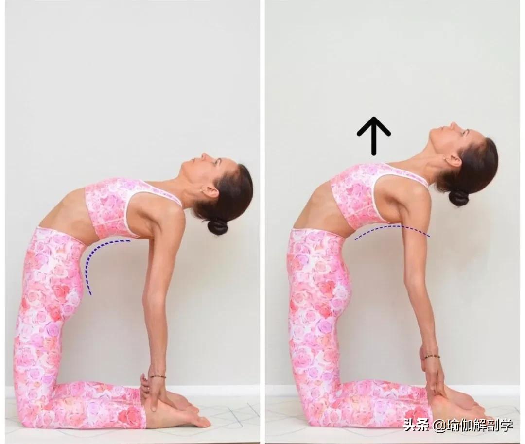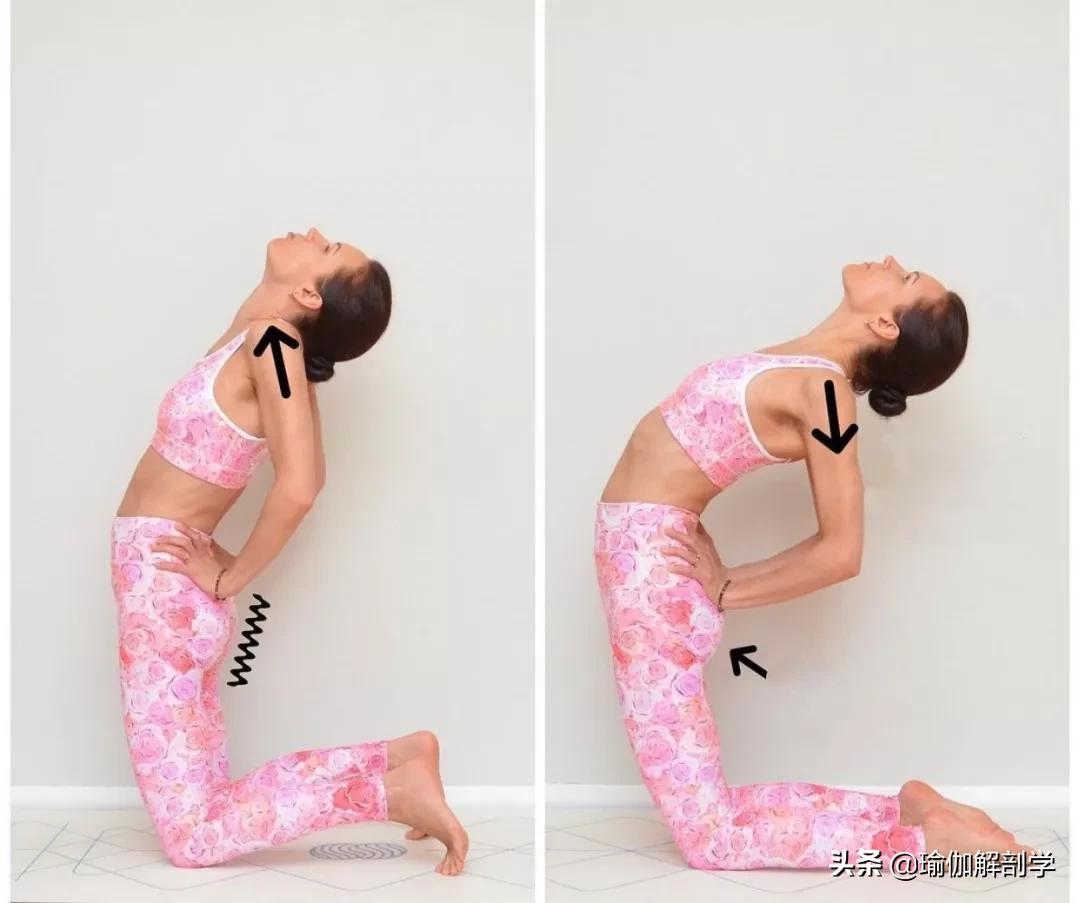 第4个易错点很多人胸腔没有展开同时肩膀由于紧张会向上耸肩核心、臀肌没有启动导致腰椎挤压正确练习应保持胸腔打开向上推双肩远离耳朵,核心、臀肌启动正确练习骆驼式: