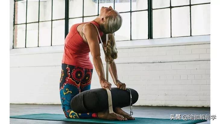将伸展带做成背背佳的形状帮助胸腔打开向上推同时可以在小腿处放瑜伽抱枕帮助后弯时增加脊柱的延展度对于颈椎、腰椎有伤病的练习者,建议在专业的瑜伽老师辅助下才能练习骆驼式哦!