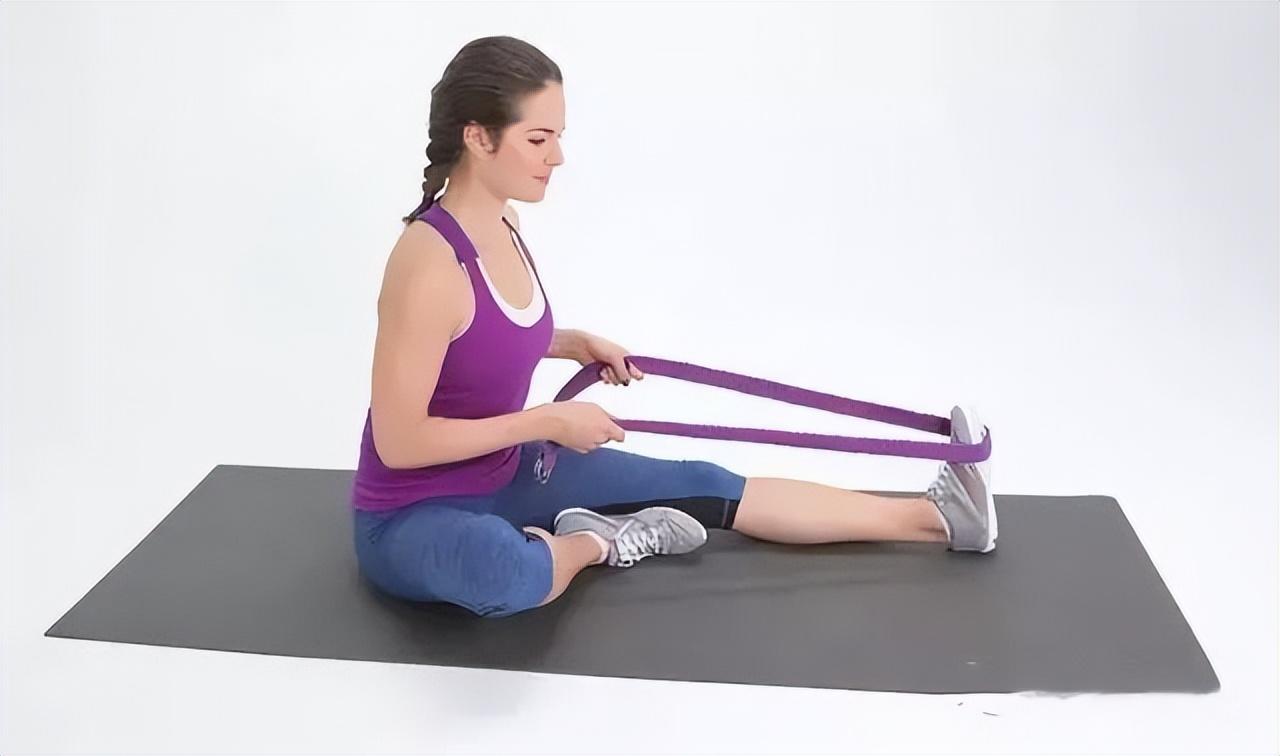 坐在地上,如果你觉得你大腿后侧太紧,身体坐不直,那你可以坐在抱枕上,保持脊椎挺直。曲右腿并伸直左腿,使用瑜伽带或者弹性带包住左脚。利用瑜伽带把你的脚趾往身体方向拉,并保持左膝压地。坚持20-30秒,然后换边。4. 下犬式