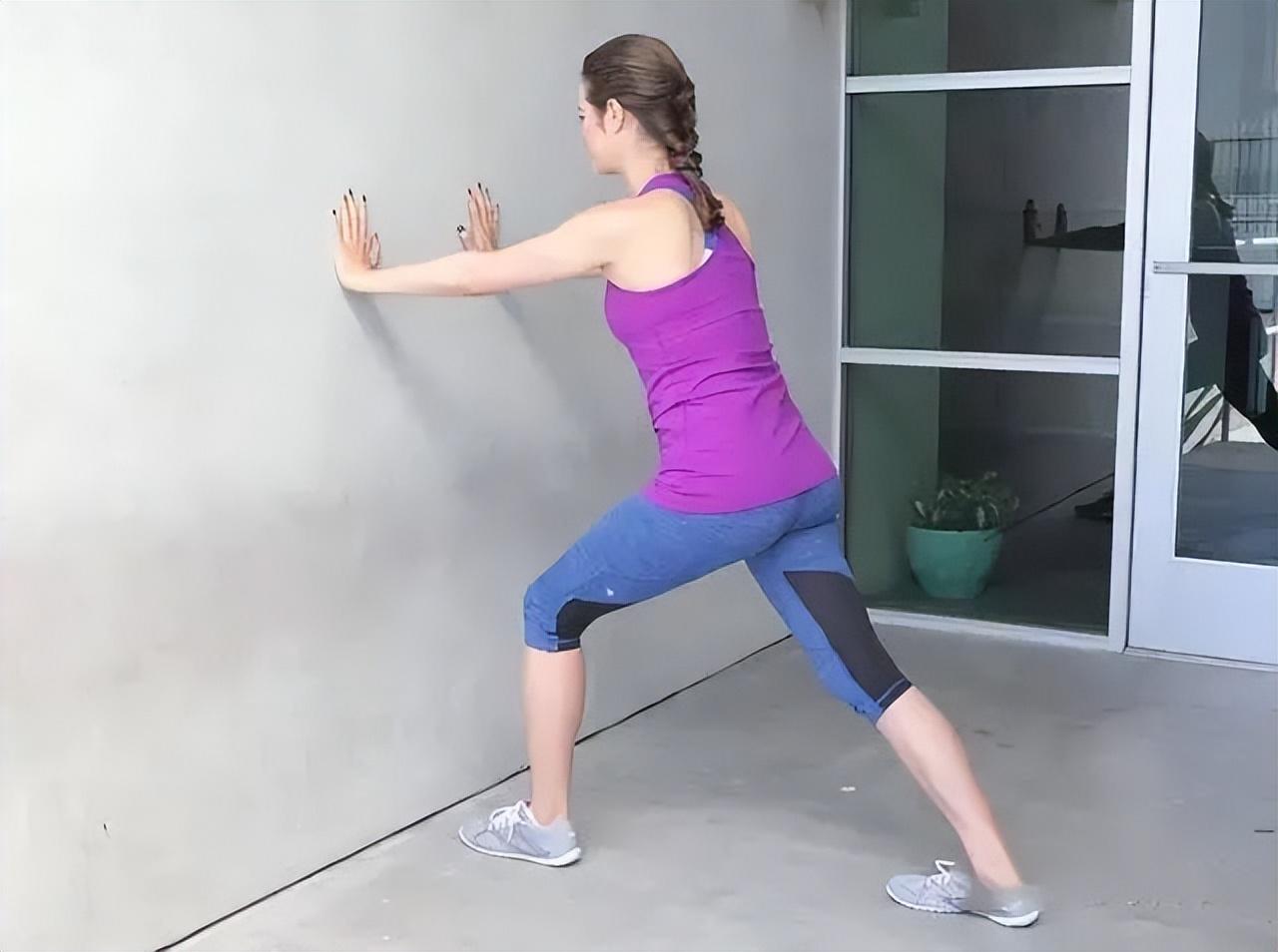 站立离墙不足一个手臂长度,左腿在前,右腿在后,保持双脚平行。曲左膝且压力作用在右脚后跟。保持20到30秒钟后换边。2. 前脚掌踩墙拉伸