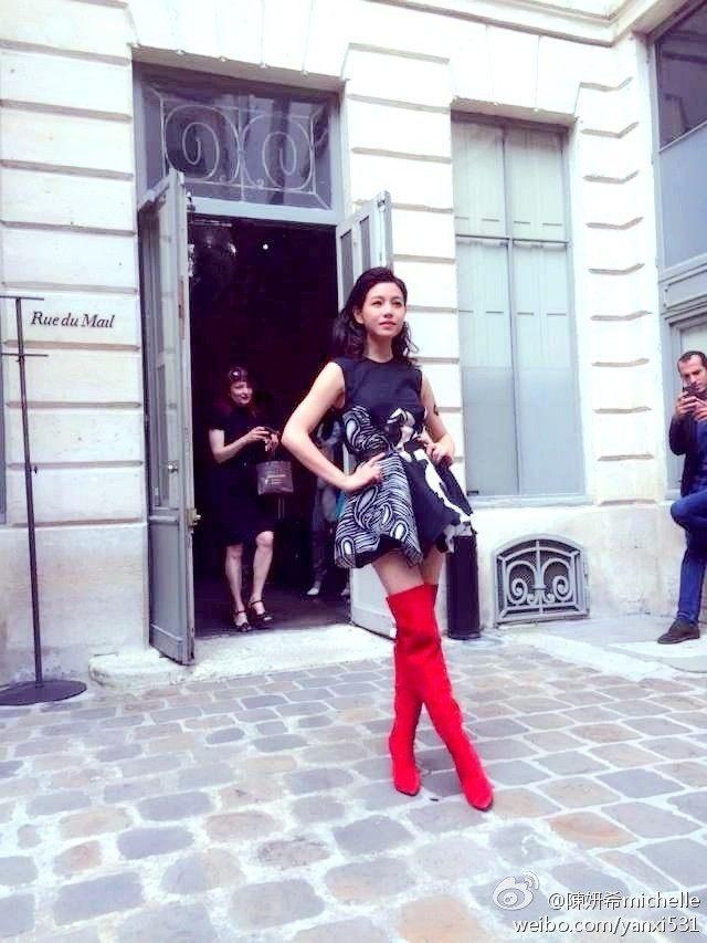 在2015年春夏时装周的陈妍希选择了一套黑白拼接印花裙,但是搭配了令人费解的红色大长靴,发型有点老气,而且这双红色过膝靴成为了全身的亮点,不仅没把身材拉长,还有一种小朋友穿着妈妈高跟鞋的既视感。