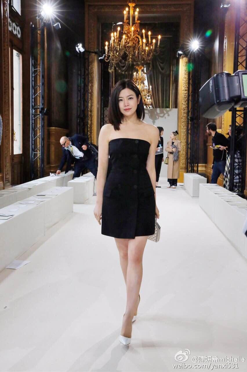 2016年的巴黎秀场上陈妍希一袭黑色收腰抹胸裙看上去精练中不失女人味,干练中带着柔和。正装排扣的设计添了一份帅气,虽然黑色略显深沉,但这一身做到了减龄又可爱。
