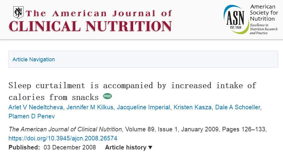 1.《Sleep curtailment is accompanied by increased intake of calories from snacks》