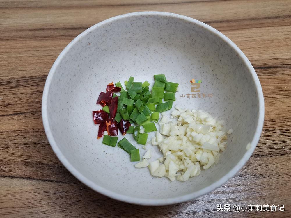 3、准备一些料头,小葱切成葱花,2瓣蒜切成蒜蓉,1个干辣椒掰碎。