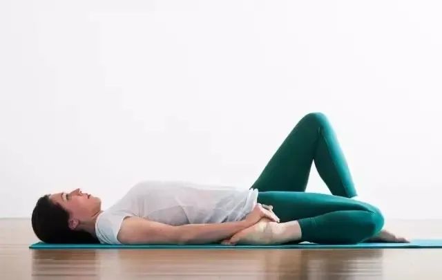 单腿卧英雄式,双腿保持跪姿,然后臀部放在双脚上,双腿左右分开,让身体向后躺倒,将左腿打开,保持左脚支撑,右腿依然弯曲,右臂伸直,右手抓好右脚,保持1分钟,换左腿弯曲。