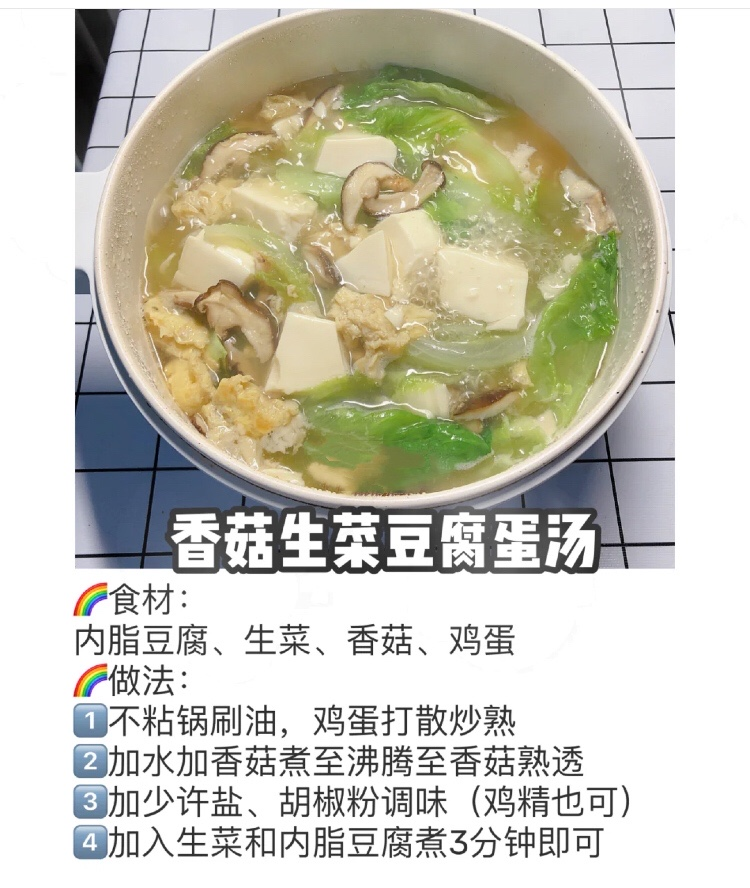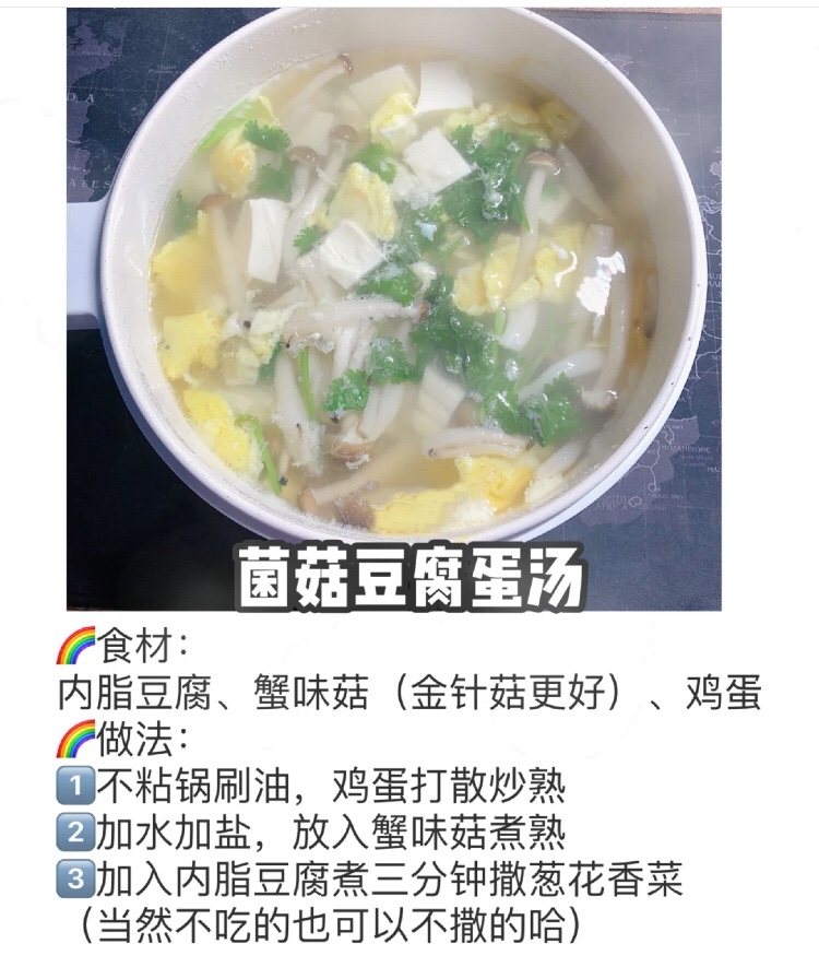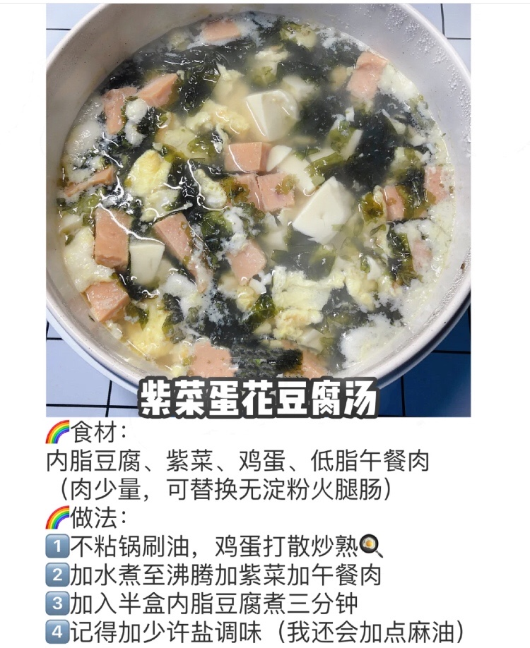 这个汤真的很经典了,紫菜蛋汤相信很多人都喝过,加上豆腐,就多了一层饱腹感,即使减肥也不能饿着呀