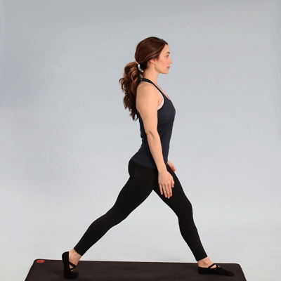 山式站立,双脚分开大于一腿长转脚转身朝左侧,调整髋部中正手臂上举,脊柱向上延展屈左膝,身体垂直向下降低保持8-10个呼吸,换另一侧动作5、英雄前屈式