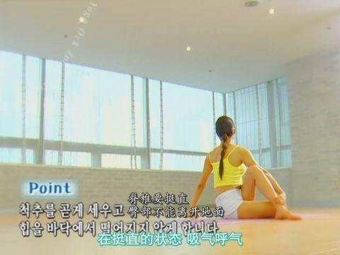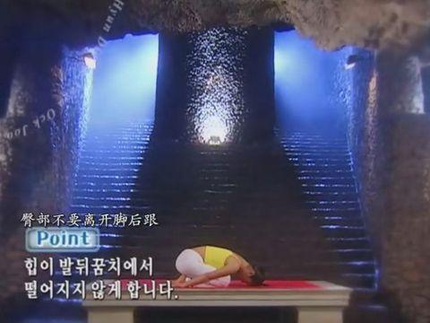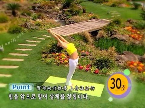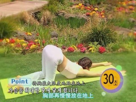 这次,将双手大限度地往前伸。这次,要把姿势坚持30秒。先把下颚放在地上,胸部再慢慢放在地上。这时,胸部和肩膀不能贴在地面的人,不要太勉强用体重压。呼气的时候,慢慢将胸放下贴在地面。这个动作可刺激脏器官,预防便秘,增加脊椎弹力,是对消除臀部的疲劳很有好处的动作。三,二,一,恢复。坐着放松身体,轻松的呼吸3次。