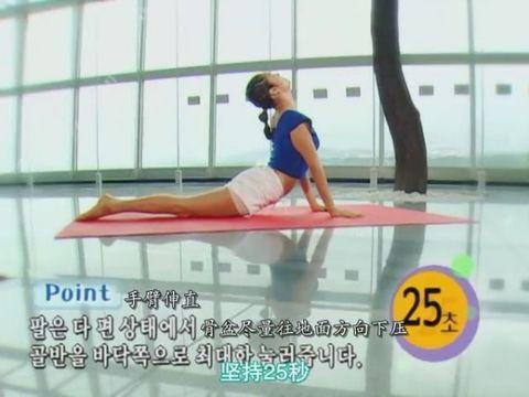 平卧。眼镜蛇动作增加脊椎下面的肌肉,臀部曲线,还有臀部,腹部弹力,对这些很有帮助的动作。先从脚跟到臀部,腹部,紧紧用力,手放在胸前的稍微低一点的地方。手指全都打开才能加大着地力度。手臂紧贴在身体两侧,现在利用脊椎下面的肌肉,提高上半身。吸气呼气抬身。视线看向45度的天空。坚持25秒。这时,收紧臀部,将两腿紧贴,在脚跟上再用力。这个动作矫正向前弯的肩膀和背部,美化双腿和臀部曲线,对腰痛患者很有果,强化腰部。三,二,一,恢复。