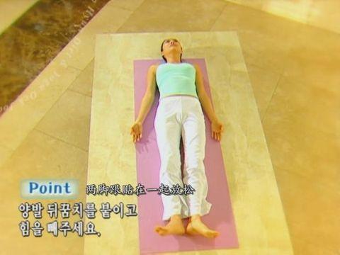 现在,所有的玉珠铉减肥瑜伽中文版动作都结束了。舒服的躺下来休息。两手放在两侧向天空,两脚跟贴在一起。感受到通过手掌,温暖的空气进入身体。闭目休息,感受一下从脚跟到头部的全身的能量。感受到能量就会感受到呼吸。吸气时,胸是凉爽的感觉。呼气时,胸是舒服的感觉。用这种感觉,反复呼吸。感受到了柔和的能量,身体就会放松。感觉身体舒服,感受舒服的呼吸,心就会觉得平和安详。所有动作都结束了,等待果吧!