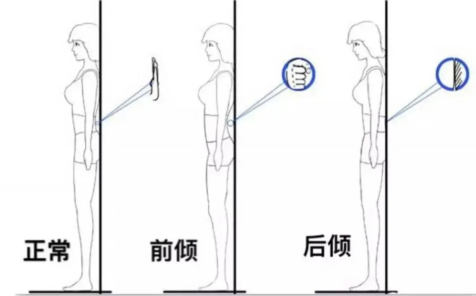 正常情况此时腰部与墙之间可以放入一个手掌,如果大于这距离,能把拳头放进去,那么可能存在骨盆前倾。