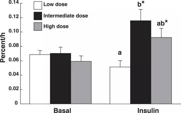 如上图,注射中等剂量的胰岛素(b*)合成代谢率显著高于对照组。