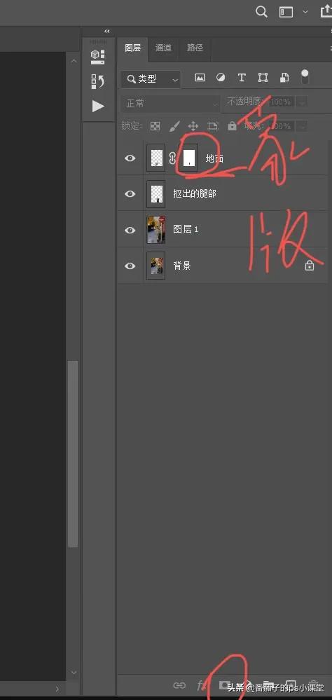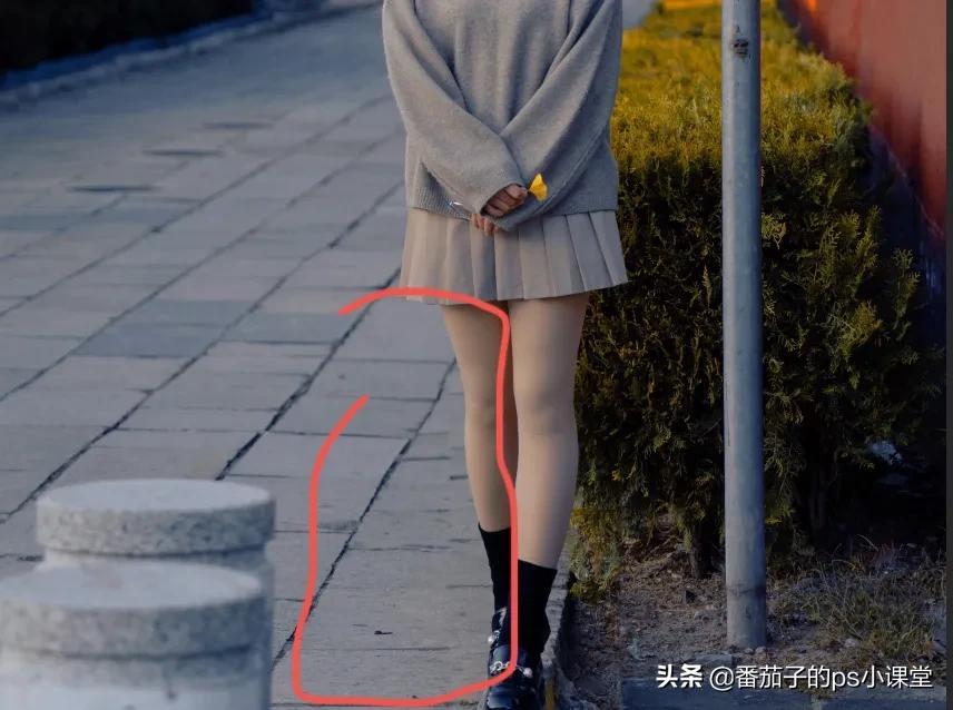 6、拉张之后地面可能不整齐了,可以使用钢笔工具进行抠地面然后复制一层,把地面放在腿部图层的上方然后添加蒙版进行擦拭腿部进而更好的使地面平整。(地面平整的可以不用这一步)