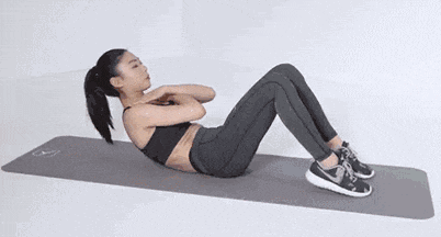 选择仰卧位,平躺于地上,双腿弯曲,双脚尖贴地,臀部往下保持稳定,始终不动,双手交叉放于两肩膀,用力抬起上背部,同时,下背部保持不动,到达顶点,停顿,自主控制缓慢向下恢复到平躺的位置。