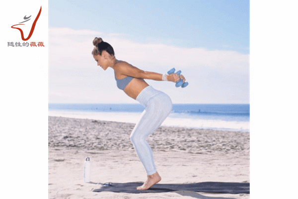 双脚并立,脚尖掂起,双手握哑铃,手掌面向内,弯曲你的膝盖,弯曲的你肘关节,把你手中的哑铃向身后抛动,把你的臀部翘起,坐在你想象中的悬空的椅子上,当你把胳膊伸到身后时,用你的核心来保持平衡,当你把胳膊放回身体时,保持肘部紧贴躯干。共三组,每组十五次。