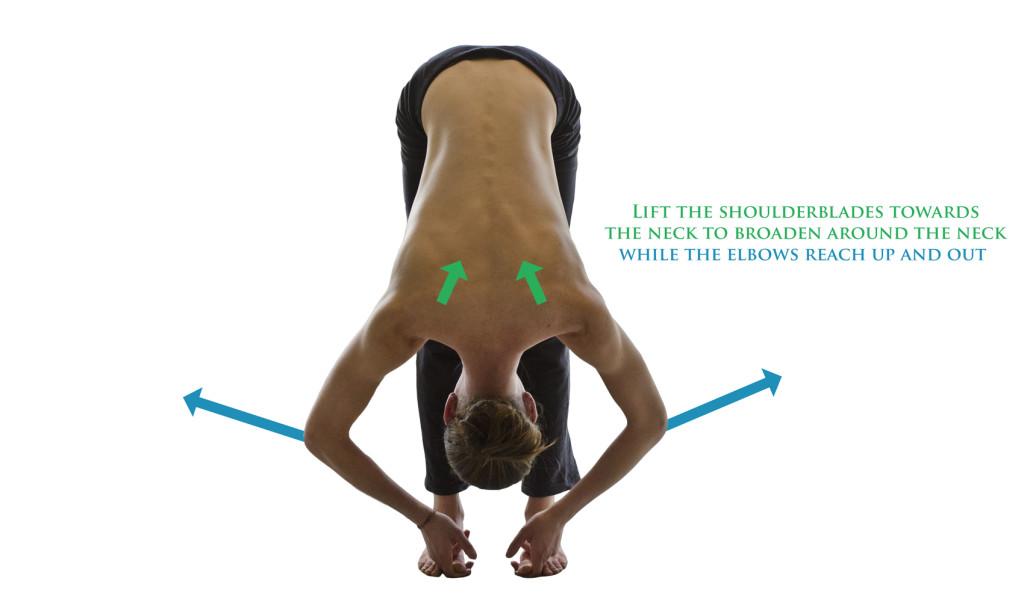 如果不能完全将手掌放在脚下,让脚趾接触到手腕,这以一种稍微不同的方式挑战肩膀的灵活性,请你专注于拓宽颈部周围的空间,并将肩胛骨拉向臀部,抵抗重力。
