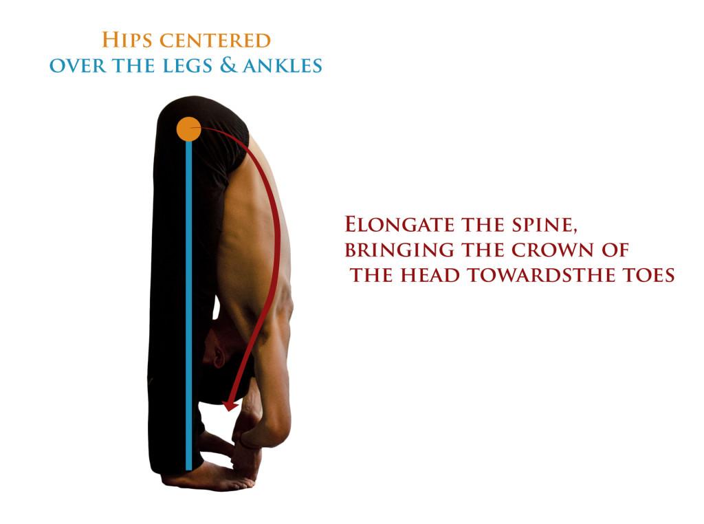 在髋部的折痕处折叠起来,仅仅通过骨盆的旋转,缓慢的呼气。用胸骨折叠,而不是用头部。用前两个手指抓住大脚趾。如有必要,弯曲膝盖,但保持背部挺直。吸气,伸直手臂,向前看,坐骨抬向上,背部凹陷,尽可能向前旋转臀部(你会感觉到腿筋加长)。