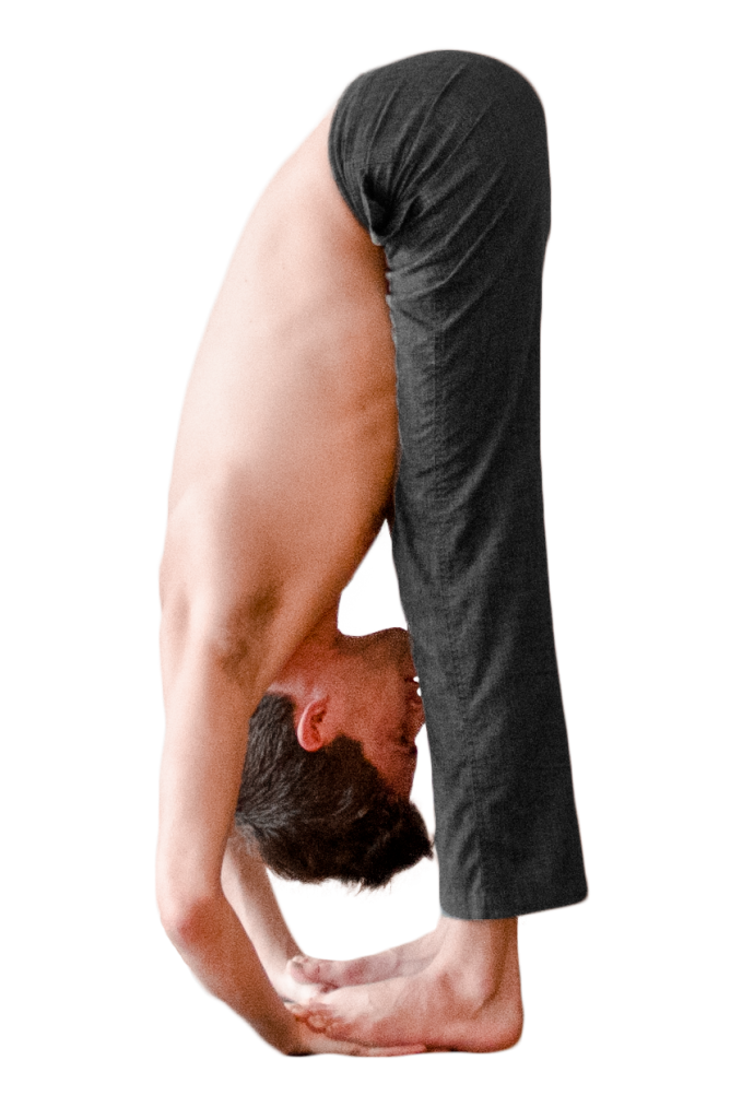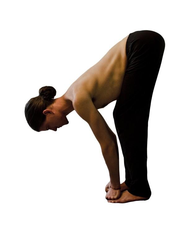 保持背部的平坦和髋部的旋转,呼气并完全向前折叠,允许头顶向脚趾下降。肘部向两侧伸展。