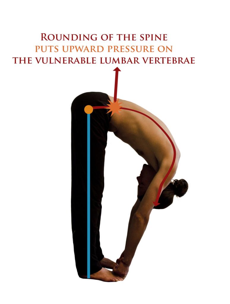 在这个位置,紧张的腿筋损害了向前折叠的机动性。手仍然可以够到脚趾,但是现在弯曲来自腰部而不是髋部。上半身的重量挂在腰椎上,导致椎间盘向上凸出。随着练习,会导致下背部疼痛或椎间盘突出。这对于以前有腰椎或腿筋损伤的人来说尤其危险,因为该区域已经很脆弱,灵活性和力量有限。