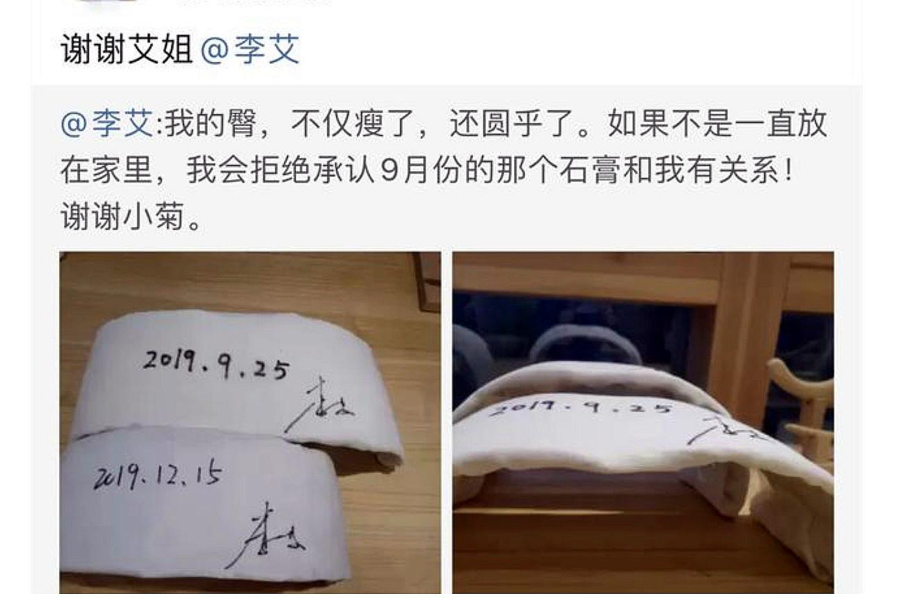 从石膏的细节上看,我们不难体会李艾为何开心到“特别发文”。从6月11日起李艾就尝试为臀部打上石膏,当时也是体态“宽”的时候。之后,每隔三个月左右的时候,李艾会换一次石膏。直到第二阶段,9月25日到12月15日,李艾的瘦身果为。相比刚带上石膏的时候,说瘦了一半也不为过,难怪李艾的事业状态现在是越来越好。