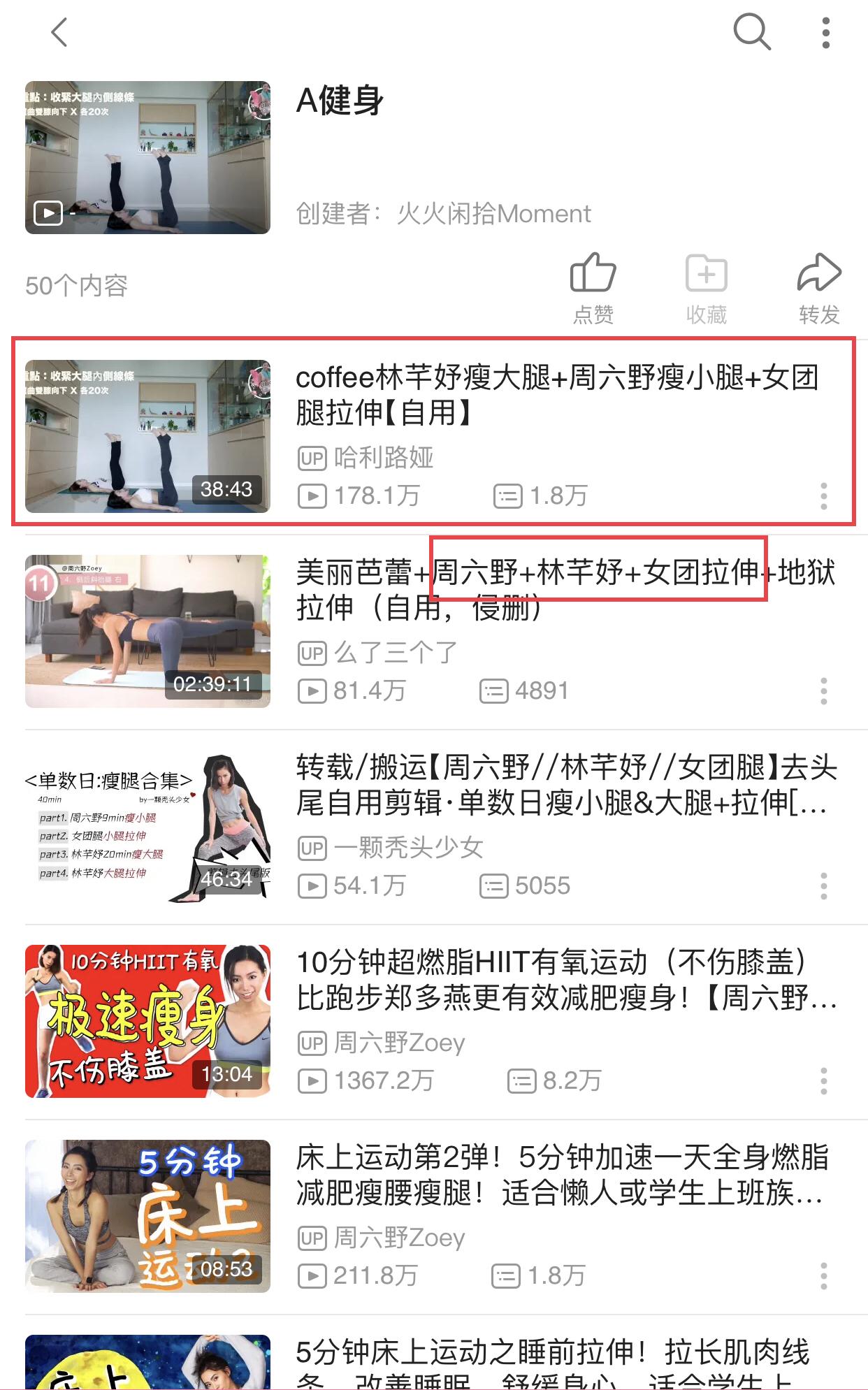 后面从第二星期开始,每天跟着B站做周六野、林芊妤、女团腿,每天晚上40分钟左右,一个视频做久了觉得枯燥就换顺序,或者换不同部位,比如做几天周六野瘦大腿再过几天做她瘦小腿的视频,反正总时长达到目标。