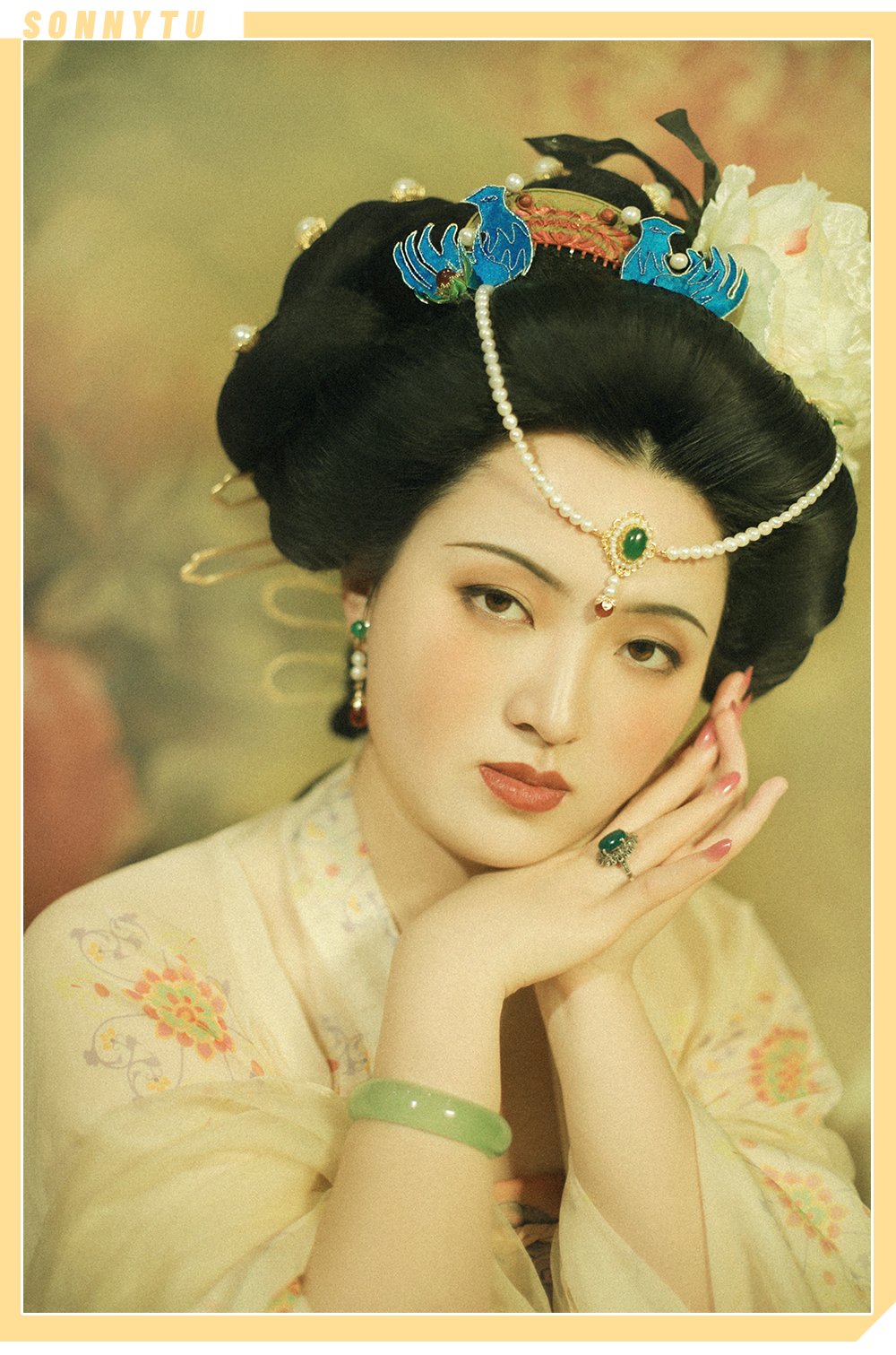 上了妆的她,穿着盛唐的服饰,整个人看起来娇憨又明媚。