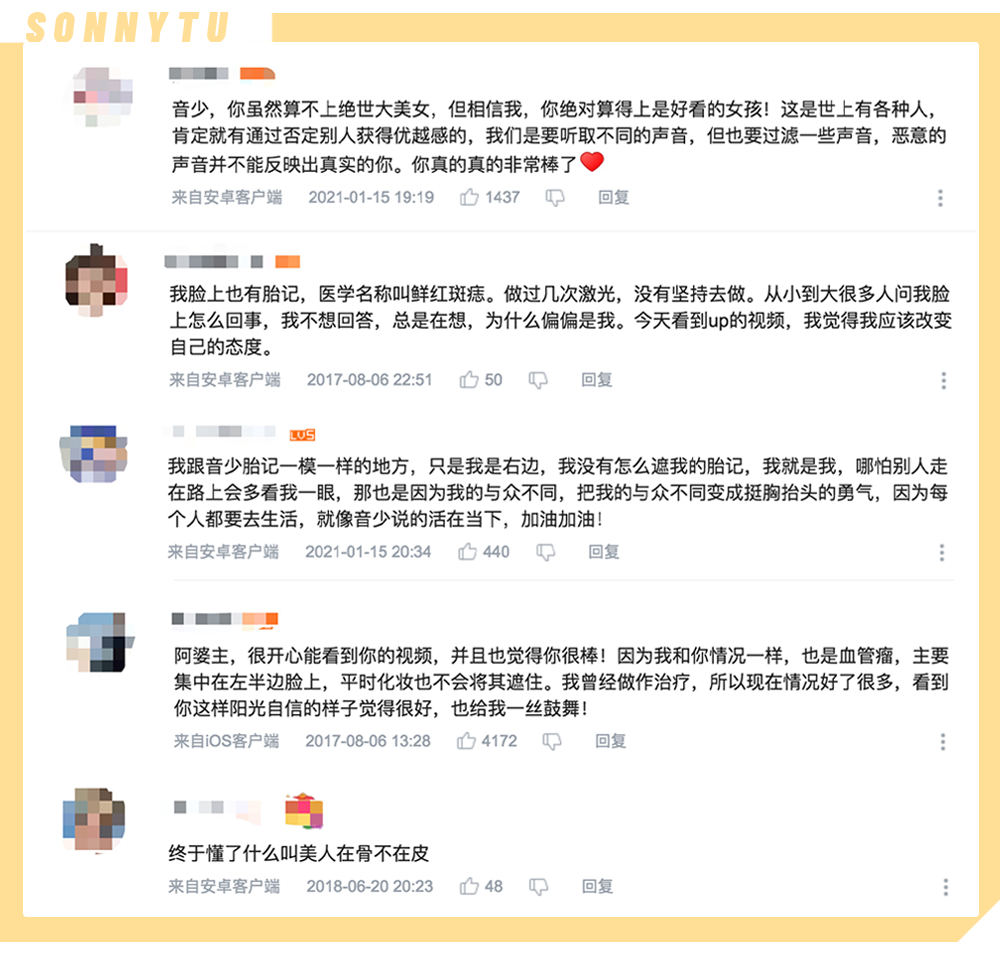 在B站,音少的经历感染了很多跟她有同样情况的人,用更积极的态度正视自己。