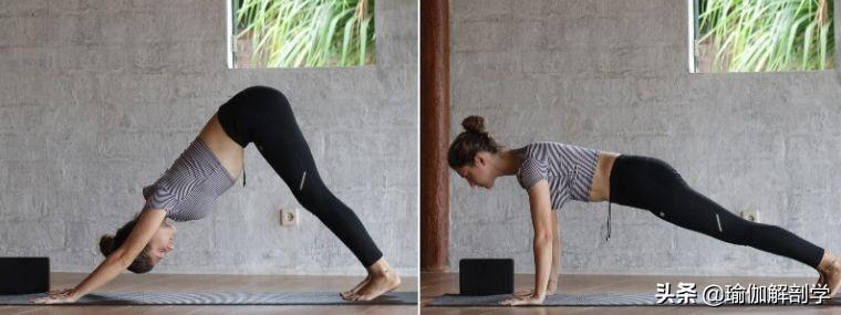吸气,双脚向后,臀部向后向上进入下犬式呼气,身体重心向前转移进入斜板式6、上犬式