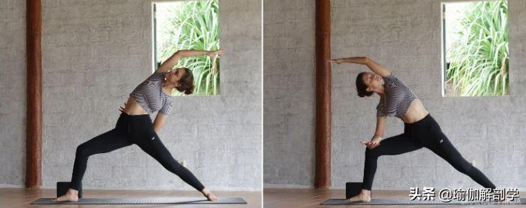 吸气,右手向上,身体向左侧弯呼气,屈右手手肘在右大腿上进入侧角式13、半月式