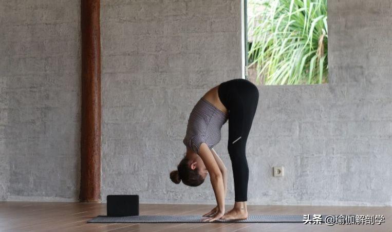 吸气,身体重心向右侧移右手拿瑜伽砖或者右手放在身体的前侧准备呼气,进入半月式14、站立前屈