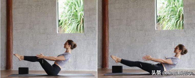 吸气,落左腿在垫面上呼气,身体前屈屈双膝,臀部向后向下15、船式