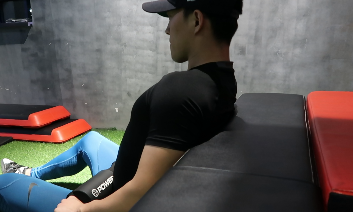 第一步 将卧推凳靠在有稳定支撑的地方,卧推凳上表面高度低于膝关节。