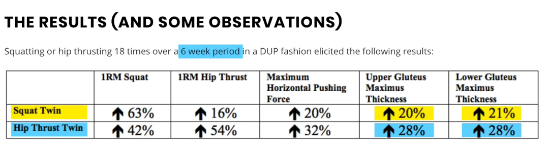 他们找了两组测试者,进行了为期6周的训练(训练方式分别1RM的深蹲和1RM的臀冲)。