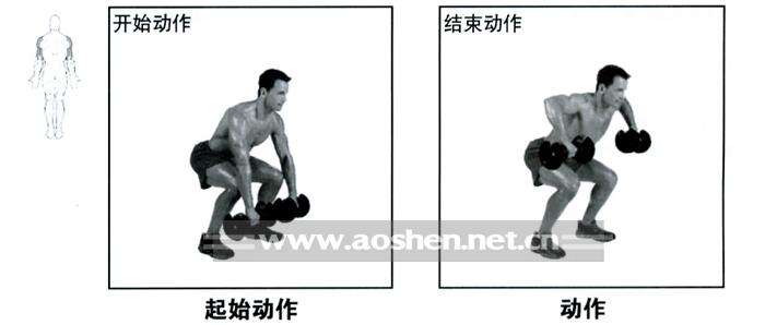 3、膝盖和臀部向前弯曲,使握哑铃的手臂微微垂于双膝前方;