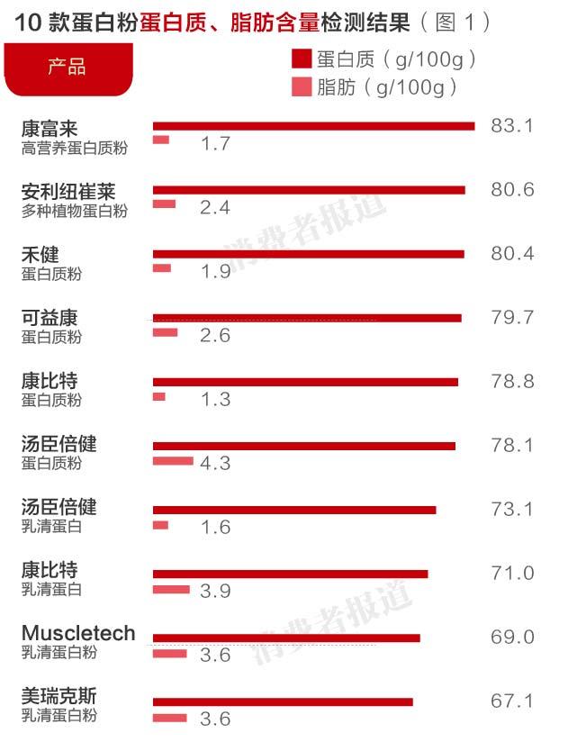 2015年9月,《消费者报道》向第三方机构送检了安利纽崔莱、汤臣倍健、禾健、可益康、康比特、康富来等6品牌混合蛋白粉,以及美瑞克斯、汤臣倍健、康比特、Muscletech等4品牌乳清蛋白粉,测定了蛋白质和必需氨基酸含量。