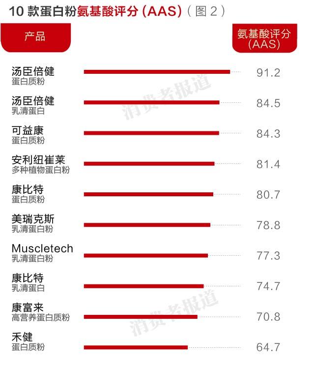 本次送检的10款产品中,汤臣倍健蛋白质粉氨基酸评分高,为91.2,而以平价保健品为卖点的禾健旗下的蛋白质粉氨基酸评分低,仅为64.7。(如图2)