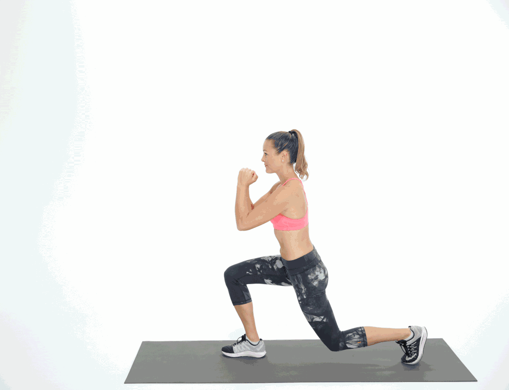 这个动作要求身体有控制并保持正确的姿势,因此可以锻炼到全身,尤其针对保护下背部、有助于核心稳定的髋屈肌和腘绳肌。左腿后撤一步来到冲刺式,两膝呈90度直角,左脚发力向上抬起,同时右脚脚跟踩实地面保持平衡,尝试用右手碰左脚尖,有控制地回到冲刺式,重复15次,然后换另一条腿重复15次。