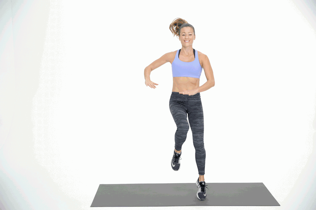 保持核心肌群收紧,把这个动作当成是站姿的仰卧起坐吧!一个好的虐腹塑臀结合体,并且是高强度的有氧运动!怎样做:做这个动作时速度要快,但同时要注意姿势正确,避免伤到膝盖,左脚后撤一步来到冲刺式,提左膝向胸前,同时向上跳起,右脚离地,轻轻落地,回到冲刺式,练习30秒,然后换另一边练习30秒。