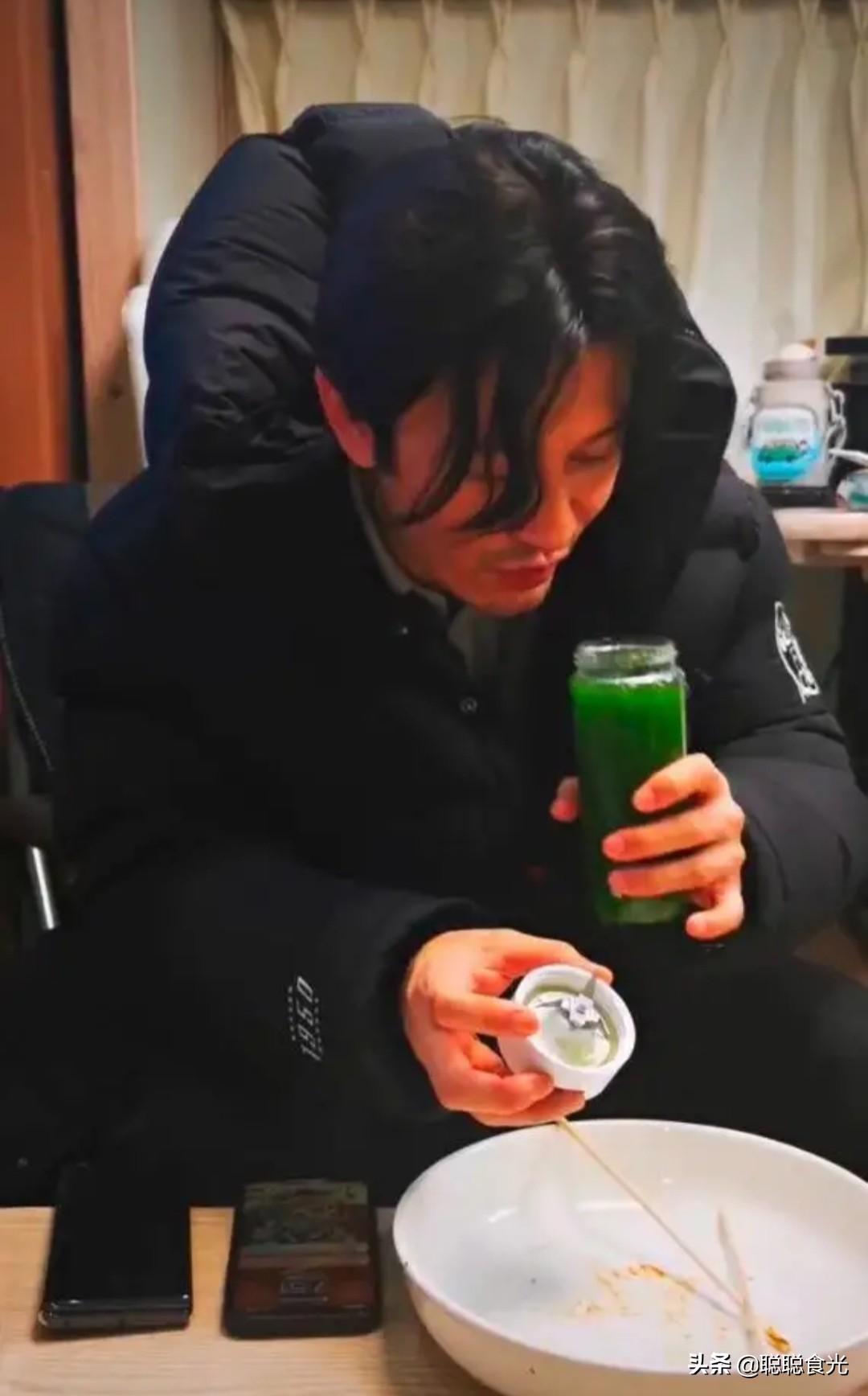这一碗蔬菜面,黄晓明没几口就吃完了,感觉意犹未尽,正当他抱怨吃不够的时候,助理又给他拿来了一杯绿油油的蔬菜汁,为了充饥,黄晓明又无奈地喝下了一杯蔬菜汁。