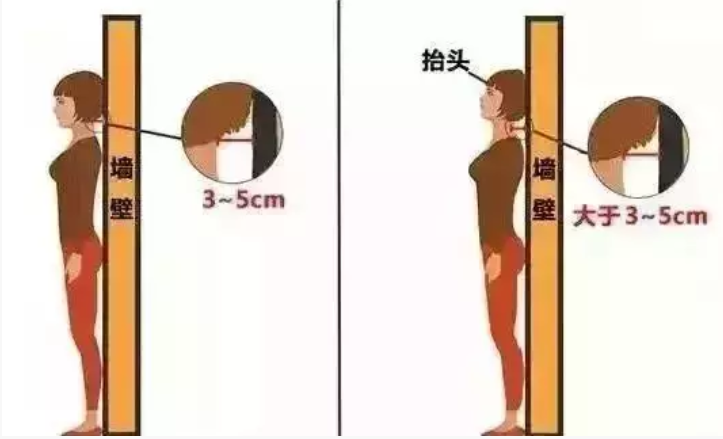 如果你能毫不费力地做这个动作,且后脖子凹陷处与墙壁的距离大概是3-5厘米,那么说明你没有真正的驼背;