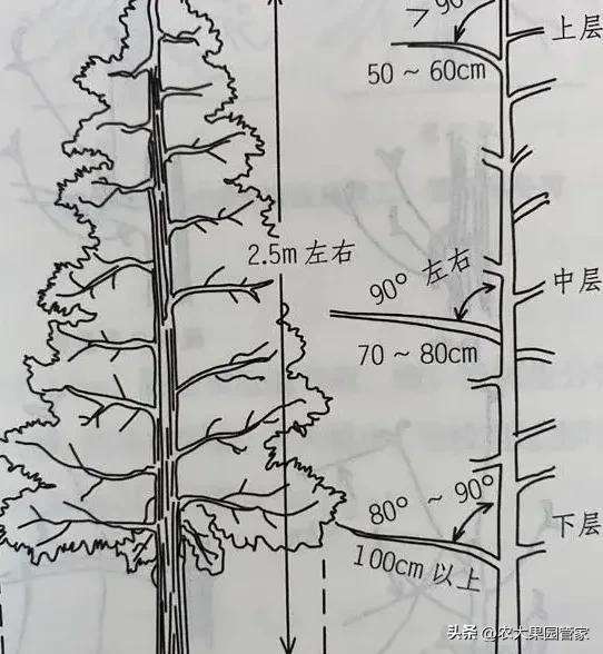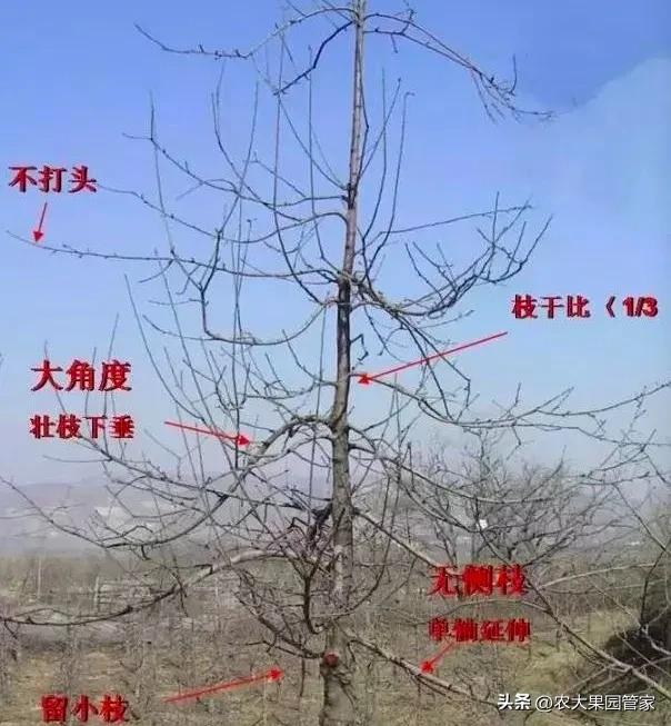 2)拉枝一般拉至近水平,长势旺、枝量大的骨干枝可拉至下垂,因坐果而被压弯的枝则应上拉,对任何超过中心干径粗12的粗枝应留柱短截。
