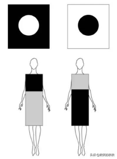 同样面积的圆形,左图中的白色看上去就是比右图中的黑色更大。所以,在搭配中,我们可以适当把深色系运用在自己需要“遮肉”的部位,腿胖就下半身穿深色,小腹突出就上半身穿深色,这样看起来才能更显瘦。