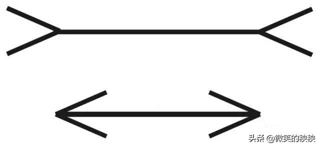 1、线条错觉运用看看下图中的两段线条,明明中间的两条横线是长度一样,但箭头方向的改变让下面的直线条看起来变短了。