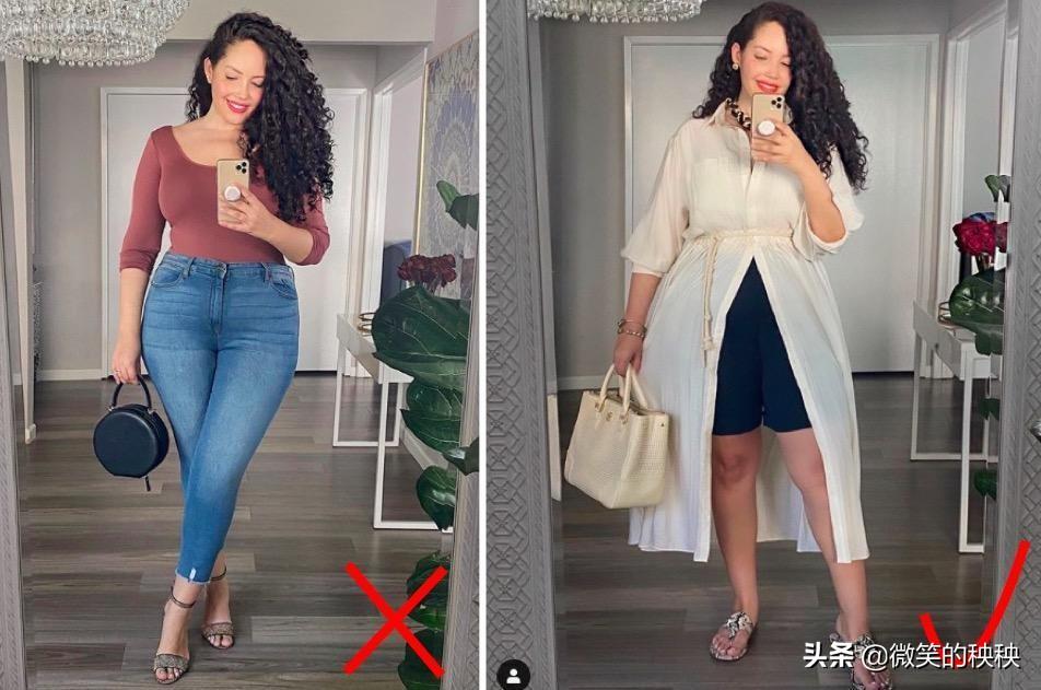 左下图中,大腿粗、胯骨宽的Tanesha Awasthi 选择了紧身款的长裤,这大腿的肉肉看得太清楚了,巨型梨状的身材美感尽失,妥妥的自曝其短。右下图中,加上外套修饰后,大腿根部的赘肉遮得很巧妙,再加上高腰线和外套、内搭的深浅色对比,让身体更是显得修长,自然视觉果好很多!