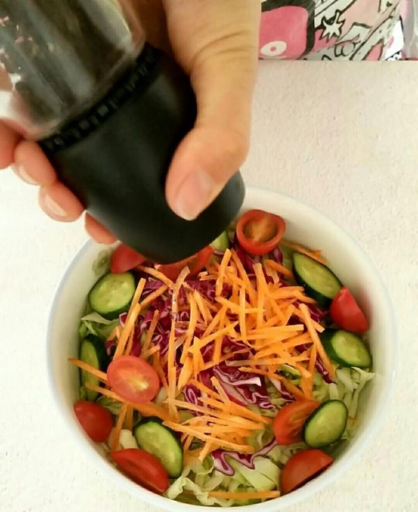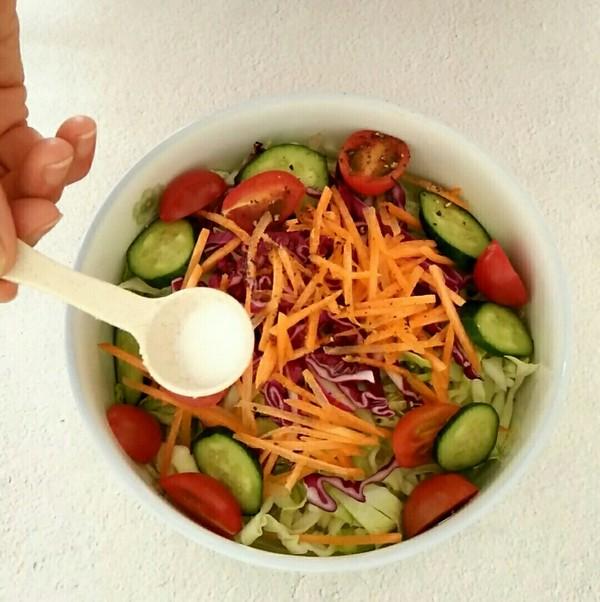 苤蓝 半个、紫甘蓝 1小块、胡萝卜 1块、黄瓜 半根、圣女果 几个、亚麻籽油 两勺、精盐 半勺、苹果醋 1勺